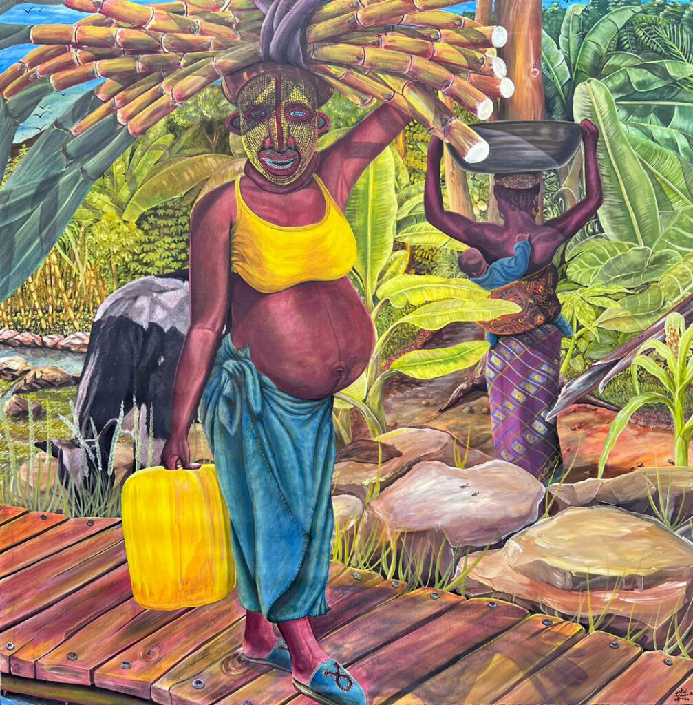 Au centre de la toile, une femme enceinte, proche du terme, se voit contrainte d’aller aux champs pour couper de la canne à sucre et la vendre. Derrière elle, une autre femme transporte de l’eau depuis la source. Cette scène est un message adressé à ceux qui, malgré leur confort, se plaignent sans cesse : il invite chacun à apprécier ce qu’il a et à mesurer sa chance face à ceux qui, dans des conditions bien plus rudes, gardent le sourire et la reconnaissance de la vie.